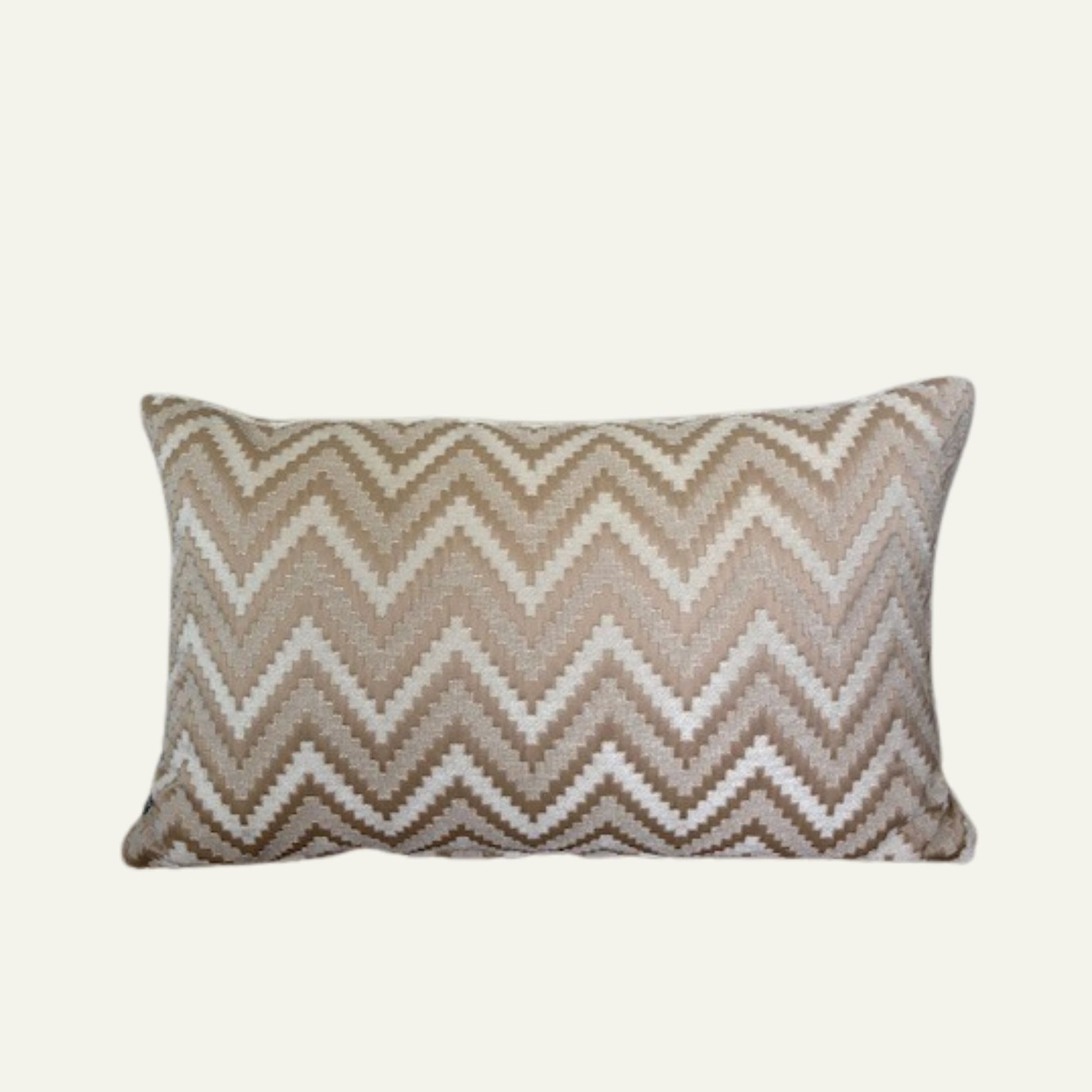 Dit rechthoekige sierkussen in beige- en crèmetinten heeft een elegant zigzagpatroon aan beide zijden. De voor- en achterkant hebben hetzelfde dessin, maar in een subtiel andere kleurschakering, waardoor je het kussen gemakkelijk kunt omdraaien voor een frisse look. Perfect voor een rustige, natuurlijke interieurstijl. Inclusief binnenkussen.