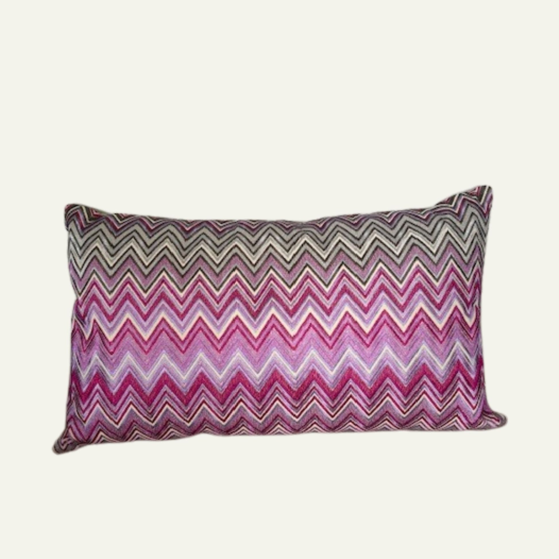 Een opvallend kussen met een kleurrijk zigzagpatroon in roze, paars en wit. Dit kussen is perfect voor wie een statement wil maken in het interieur. De achterkant heeft een effen kleur. Ideaal voor een moderne of eclectische inrichting. Inclusief binnenkussen.