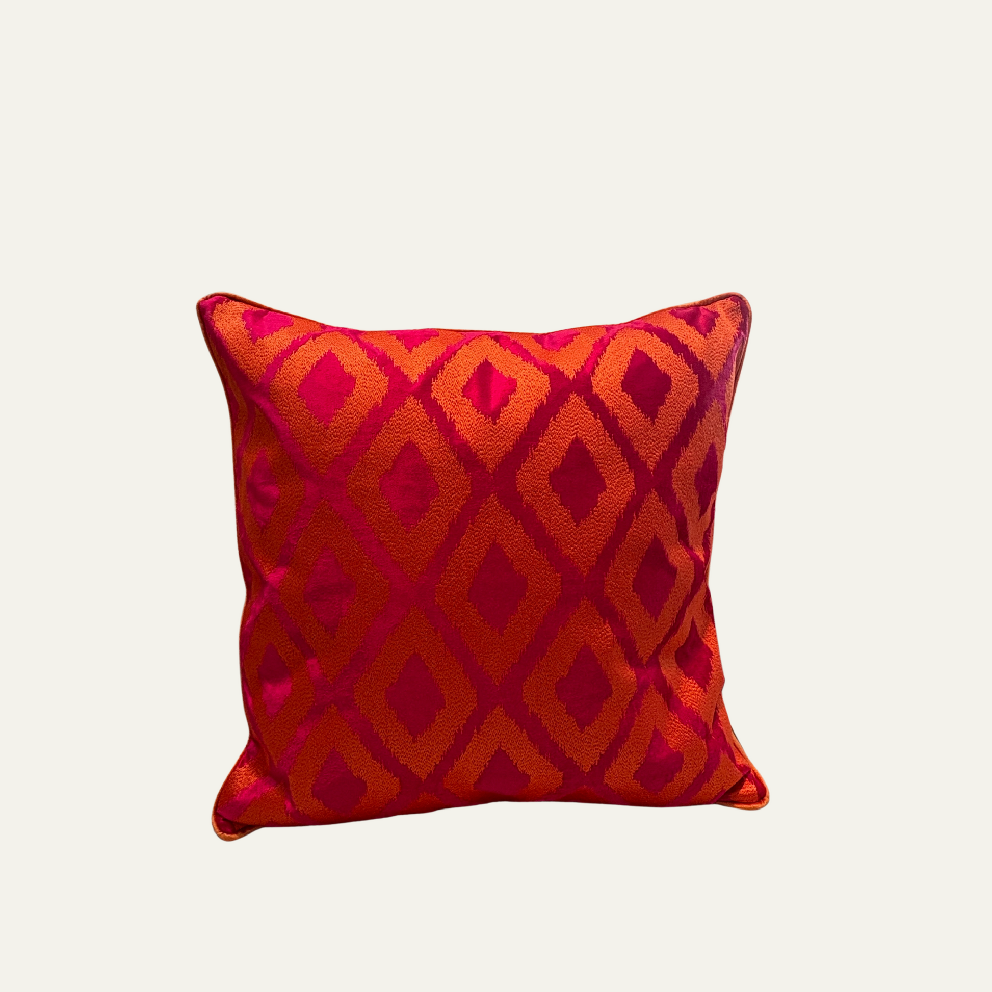 Dit Colmore sierkussen brengt direct warmte en kleur in je interieur. De krachtige combinatie van fuchsia en oranje in een strak grafisch ruitpatroon zorgt voor een moderne en levendige uitstraling. Ideaal voor op de bank, fauteuil of bed. De rijke glans en opvallende tinten maken dit kussen tot een echte blikvanger.