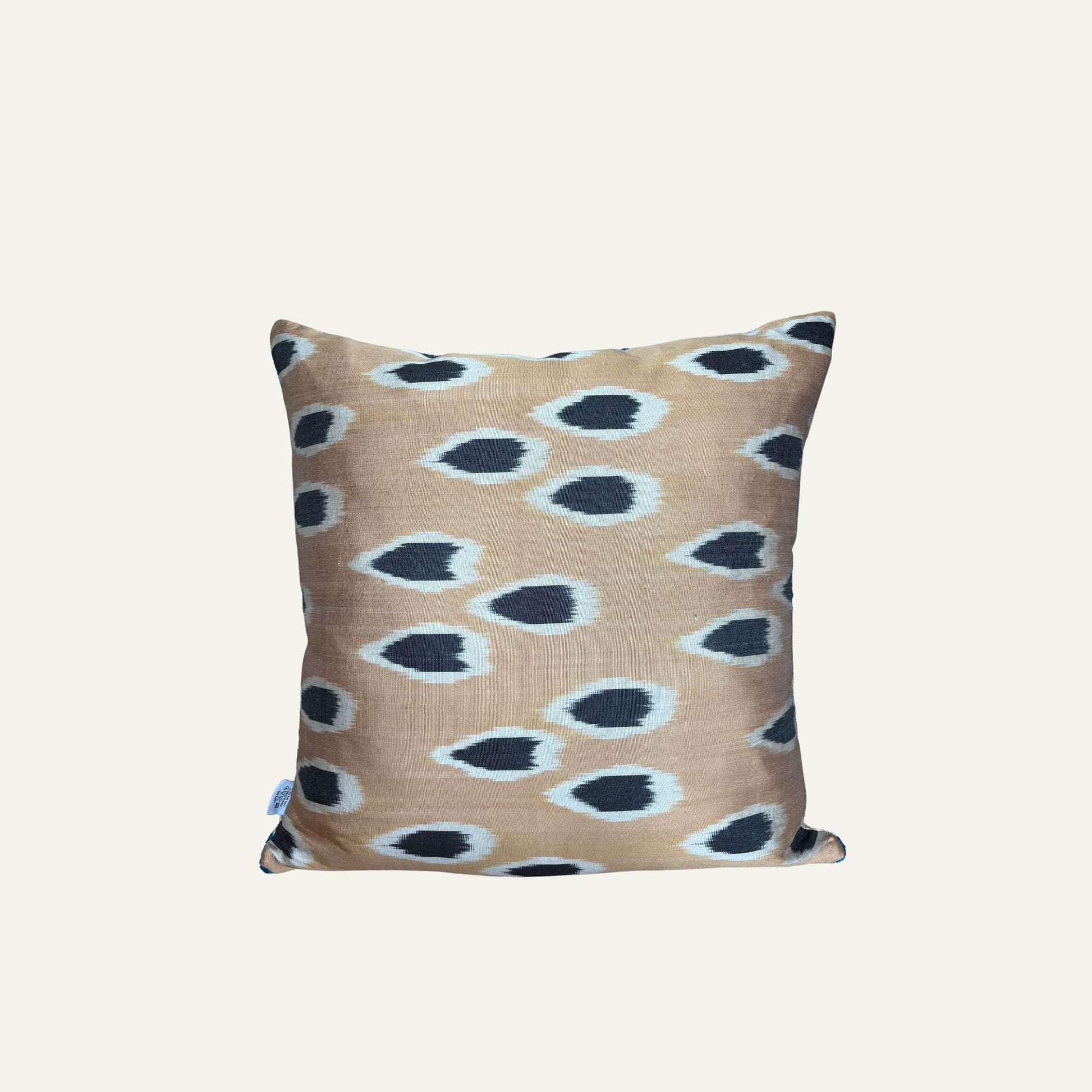 Een elegante mix van glans en natuurlijk dessin: dit luxe kussen is aan de voorkant uitgevoerd in glanzende velours zijde met een diepblauw patroon op een warme bronskleurige achtergrond. De achterzijde is gemaakt van handgeweven ikat zijde met een subtiel zandkleurig oogjes motief. Het resultaat is een stijlvol sierkussen met karakter en veelzijdigheid – prachtig op bank, fauteuil of bed.