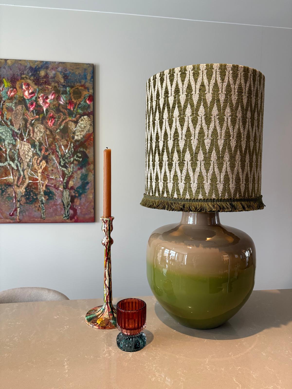 Een frisse blikvanger met een vleugje retro. De voet loopt over van zachtbeige naar olijfgroen, alsof hij met een penseel is gedipt. De jacquard kap in frisgroen met wit grafisch patroon is afgewerkt met een speelse franjerand. Deze lamp brengt direct kleur, textuur en karakter in elke ruimte.