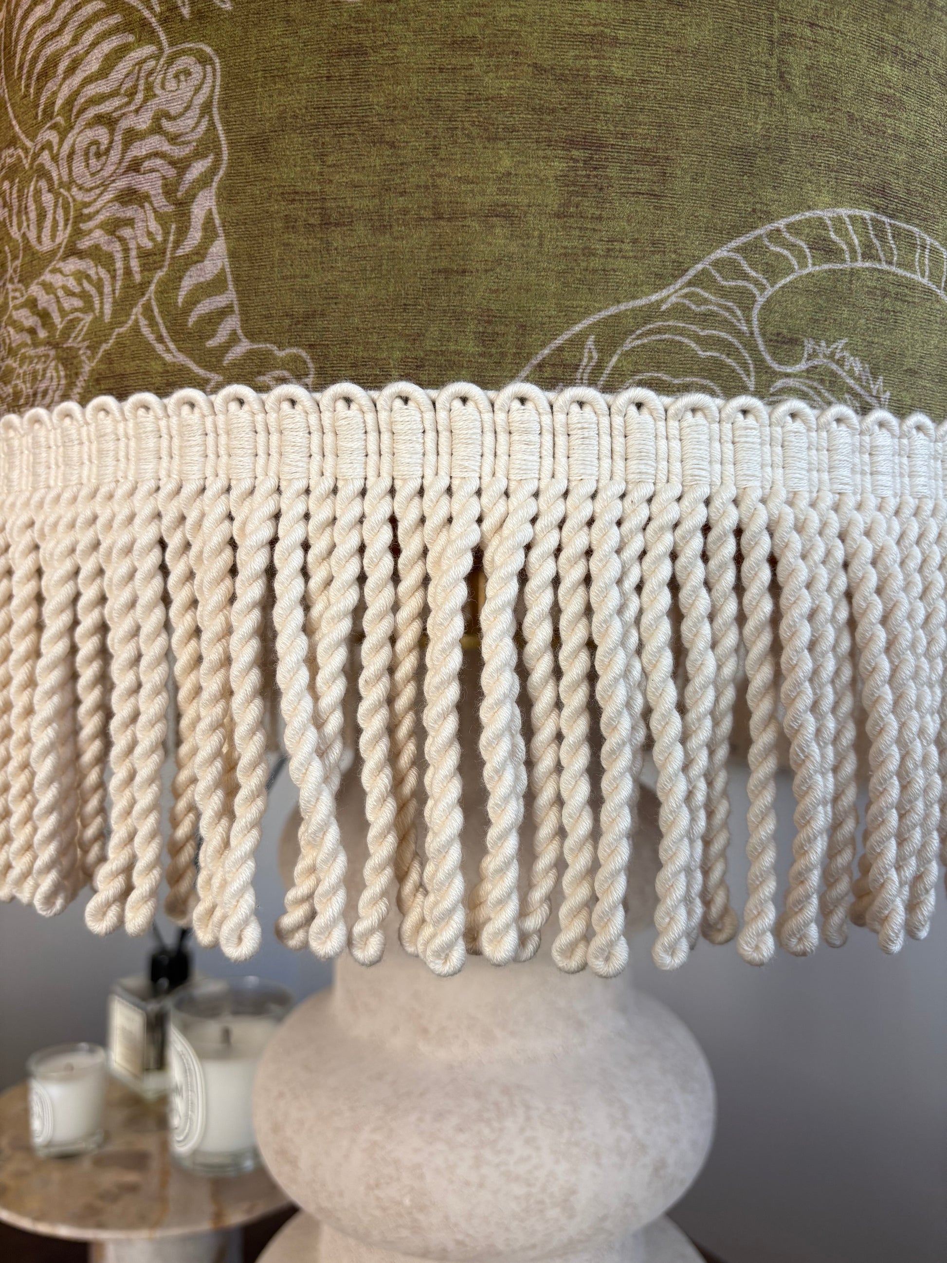• Materiaal kap: rijke stof met een velourse touch met offwhite bouillonfranje